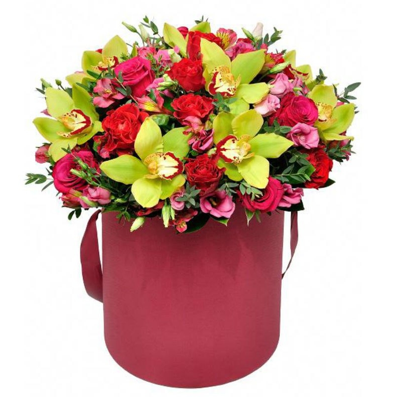 Букет состоит из 9 орхидей, 7 роз, 2 кустовые розы, 2 эустомы, 2 альстромерии, 2 фрезии, зелень, коробка, оазис.