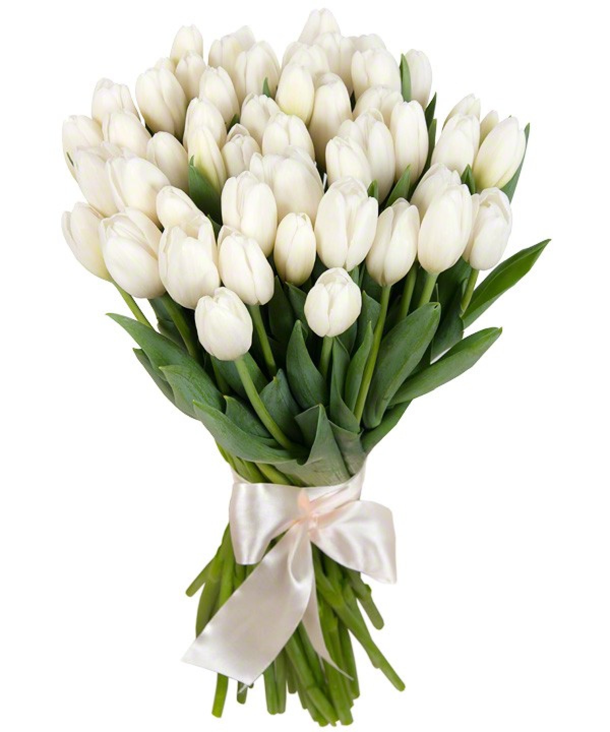 Букет состоит из 35 белых тюльпанов, прозрачная упаковка, атласная лента.