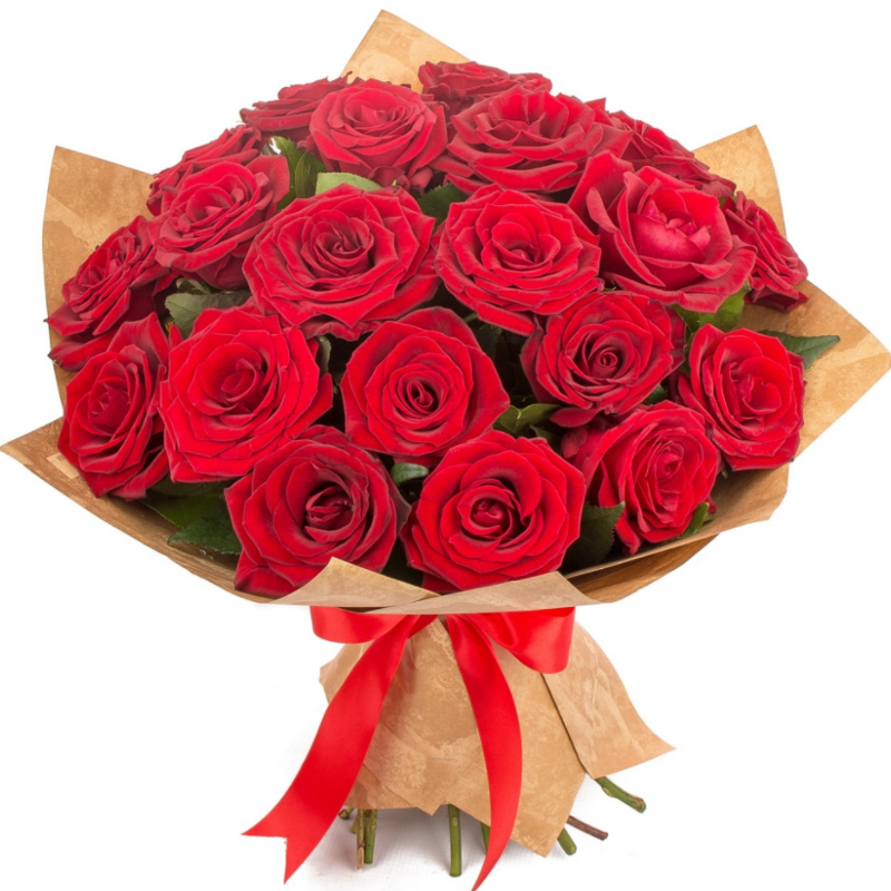 Букет состоит из 25 красных роз, крафт, атласная лента.