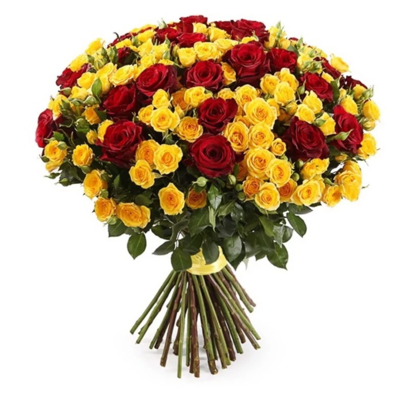 Букет состоит из 31 красная роза, 30 желтых кустовых роз, прозрачная упаковка, атласная лента.