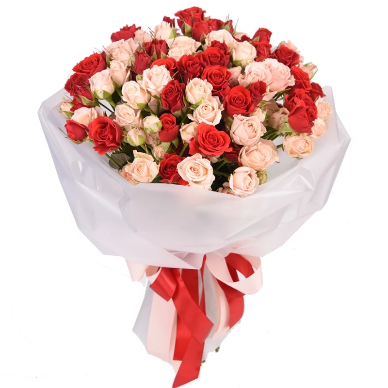 Букет состоит из MIX из 21 красной и кремовой кустовой розы, красивая упаковка, атласная лента.